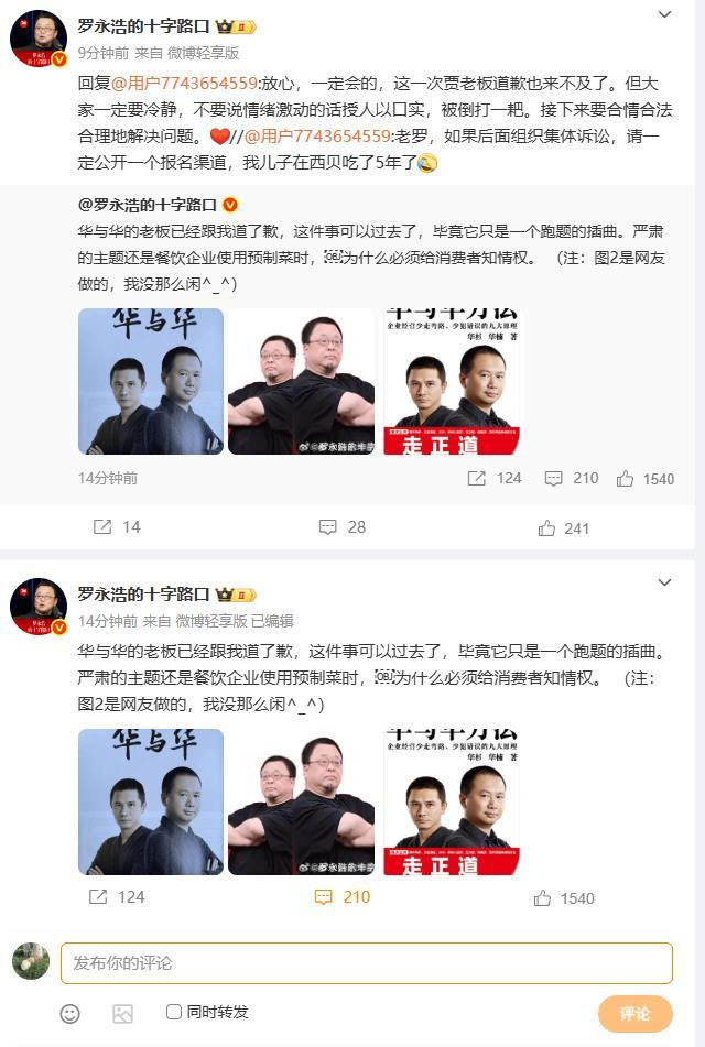 15日中午,罗永浩发微博称,华与华的老板已经向其道歉,这件事可以过去了。极目新闻记者此前查询华与华老板华杉的认证微博看到,其曾发布多条微博力挺西贝,称“西贝是拼了老命要把菜做好的企业,贾国龙又是极其爱惜自己羽毛的人,罗永浩这样的污蔑,他绝对受不了。”“是贾国龙怒了,要硬杠网络黑嘴”“遭到这种网络黑嘴的网暴,老板选择硬杠”。截至9月15日12时30分许,这些微博尚未被删除。