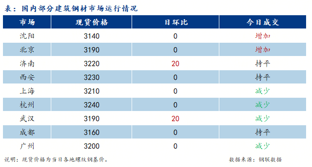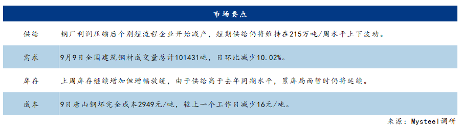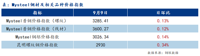 9月9日国内城市建筑钢材稳中偏强运行,高位成交一般。具体来看,早盘期螺先扬后抑,铁矿石供应端的消息带动黑色系走强,而后多头资金获利离场,价格回调,多数城市建筑钢材价格暂稳,部分小幅探涨,市场交投氛围较为活跃。午后期螺窄幅震荡运行,实际成交存在暗降出售的情况,市场交易氛围不佳。基本面矛盾逐步累积,华东、南方多地暴雨天气影响实际需求,但随着美联储议息会议临近,宏观预期较强,价格存在一定支撑,短期建筑钢材价格或延续震荡运行。全国建筑钢材成交量总计101431吨,日环比减少10.02%。