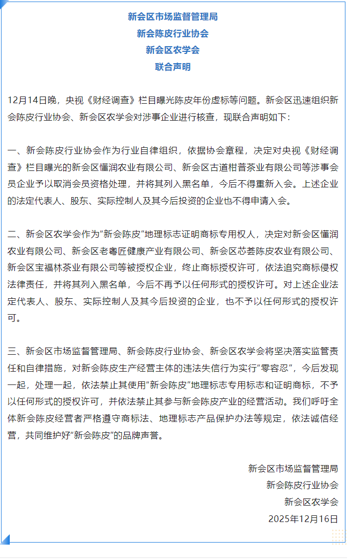 三、新会区市场监督管理局、新会陈皮行业协会、新会区农学会将坚决落实监管责任和自律措施,对新会陈皮生产经营主体的违法失信行为实行“零容忍”,今后发现一起,处理一起,依法禁止其使用“新会陈皮”地理标志专用标志和证明商标,不予以任何形式的授权许可,并依法禁止其参与新会陈皮产业的经营活动。我们呼吁全体新会陈皮经营者严格遵守商标法、地理标志产品保护办法等规定,依法诚信经营,共同维护好“新会陈皮”的品牌声誉。